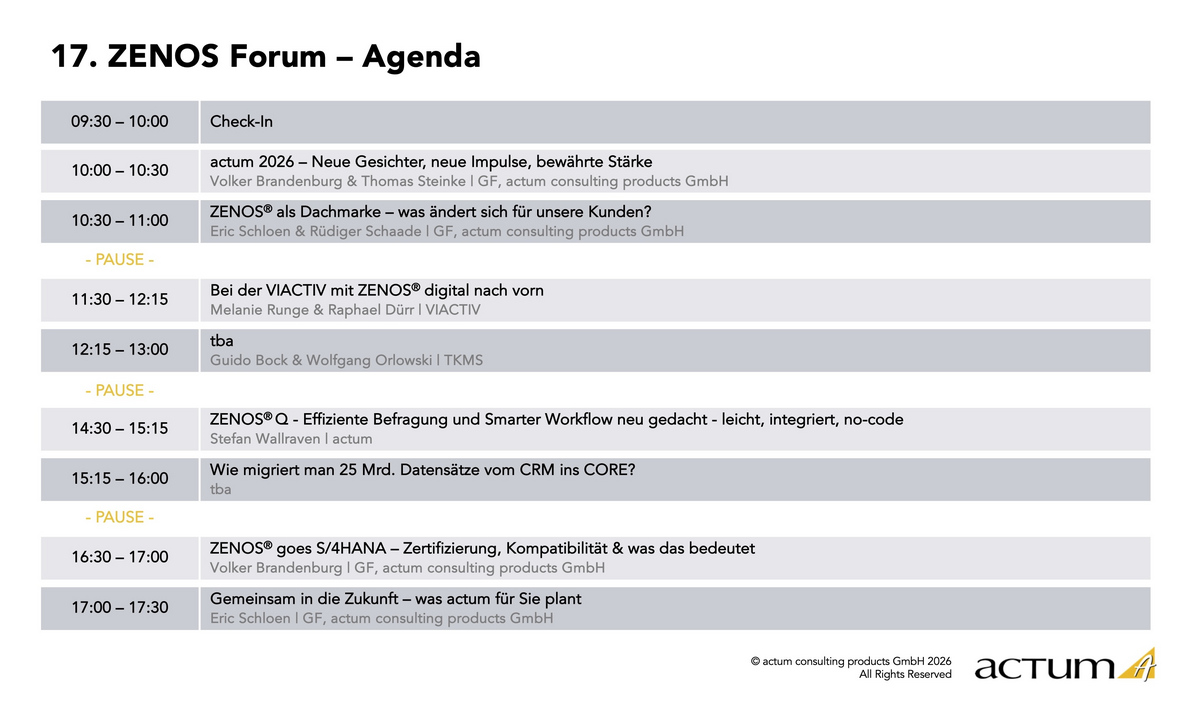 Bereits seit dem Jahre 2004 veranstaltet actum erfolgreich das ZENOS Forum und sucht dort den Dialog mit Kunden und Interessenten.